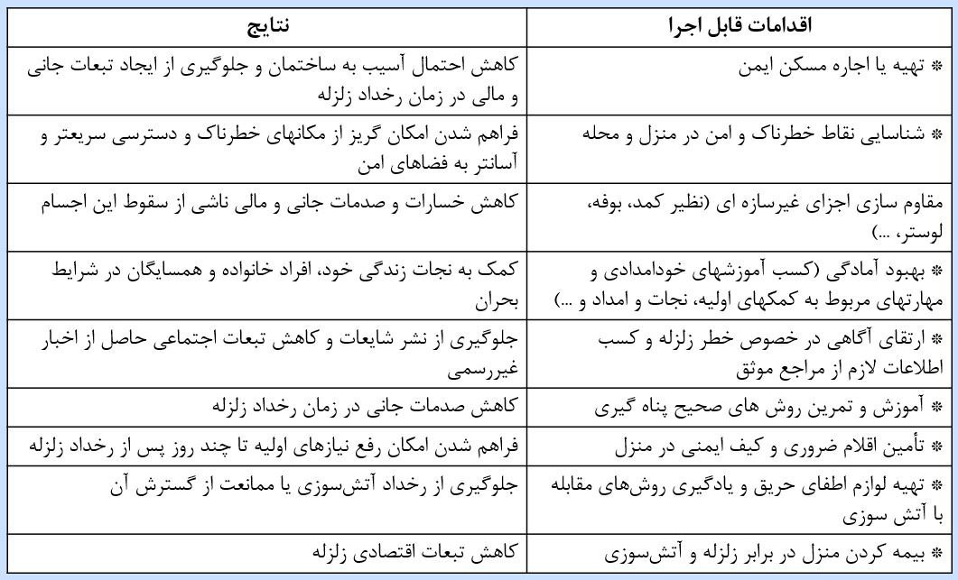 اطمینان از ایمنی محل سکونت، محل تحصیل و محل کسب و کار در برابر زلزله، مهمترین اصل در مدیریت ریسک و بحران میباشد. چنانچه حساسیت لازم نسبت به ایمنی مستحدثات در جامعه نهادینه شود، سازندگان نیز قطعاً نسبت به ارتقای کیفیت ساخت و ساز اهتمام بیشتری خواهند داشت. بررسی تجارب زلزله های بزرگ رخداده در طی دو دهه اخیر نشان میدهد که ساختمان هایی که براساس ضوابط و استانداردهای موجود ساخته شده اند، حتی در برابر شدیدترین زلزله ها پایدار بوده اند. شناخت وضعیت ایمنی محل زندگی و تلاش برای رفع مخاطرات موجود نیز از دیگر راهکارهای بهبود ایمنی در برابر سوانح است. شناسایی نقاط امن و ناامن در سطح محله میتواند در راستای این هدف تأثیر زیادی داشته باشد. این اقدام در چارچوب برنامه “مدرسه ایمن– جامعه تابآور” در حال حاضر در سطح کشور در دست اجرا میباشد. در جدول روبرو، برخی از اقداماتی که توسط مردم برای ارتقای ایمنی در برابر زلزله قابل اجرا است، نشان داده شده است.