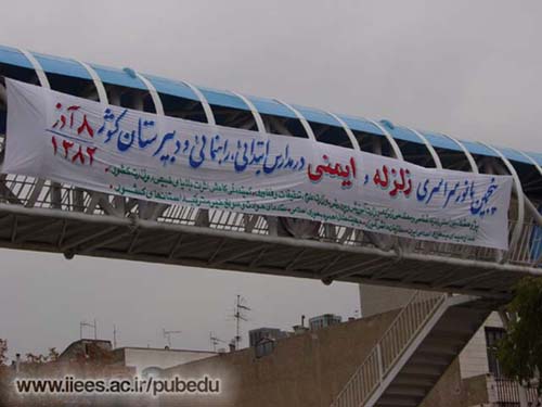 پنجمین مانور سراسری زلزله و ایمنی در تمام مقاطع تحصیلی مدارس سراسر کشور، بین ساعت ۱۰ تا ۳۰/۱۰ صبح روز هشتم آذر ماه جاری، با به صدا در آمدن زنگ (آژیر) ایمنی در برابر زلزله، از طریق شبکه سراسری رادیو اجرا شد. این مانور با هدف کاهش تلفات و خسارات ناشی از زلزله، افزایش سطح آگاهی دانشآموزان در مورد زلزله، ایجاد آمادگی برای انجام واکنشهای صحیح و سریع در برابر زلزله و ایجاد فرهنگ ایمنی، حدود ۱۶ میلیون دانش آموز را تحت پوشش آموزشهای لازم قرار داد.